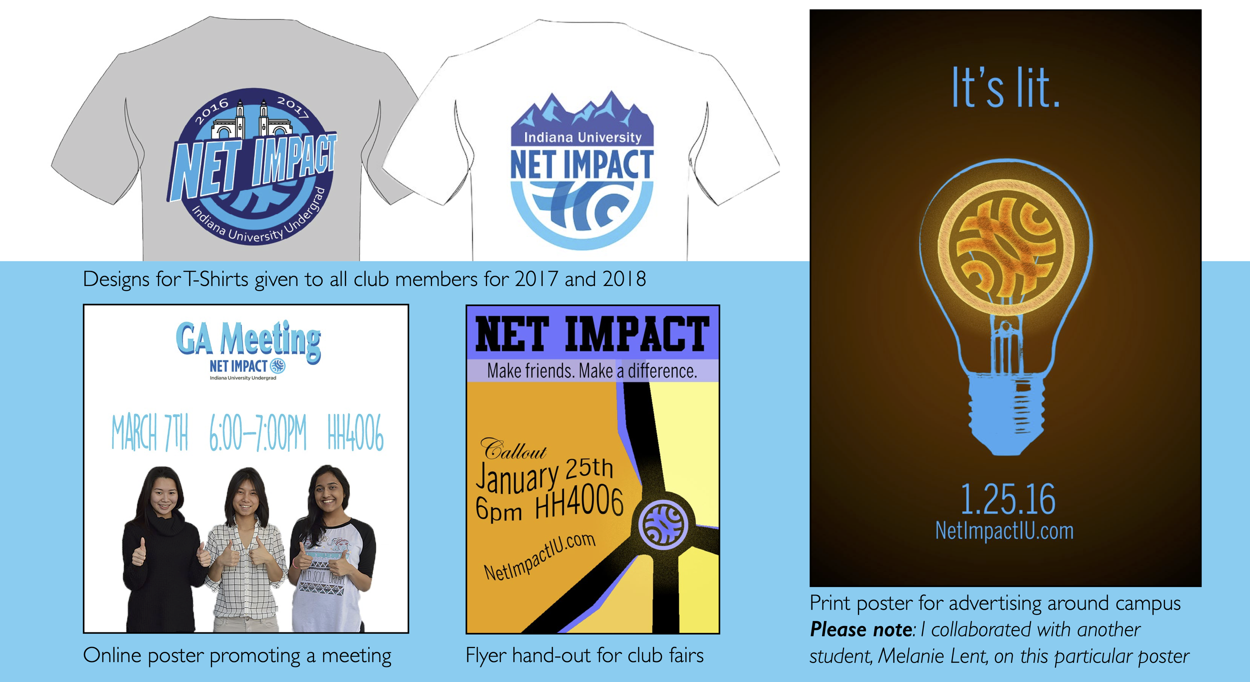 As a Director of Communications for the sustainable business organization Net Impact, I was in charge of designing promotional materials. My design goals were to use consistent branding, include environmental themes, and send a clear message.